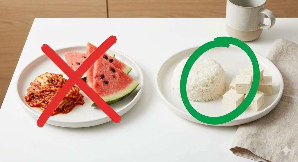 | 과일/곡류 | 씨 있는 과일 (수박, 키위, 딸기, 포도, 참외), 현미/흑미 등 잡곡밥 | 바나나, 껍질 벗긴 사과/배, 흰 쌀밥, 흰 죽 |